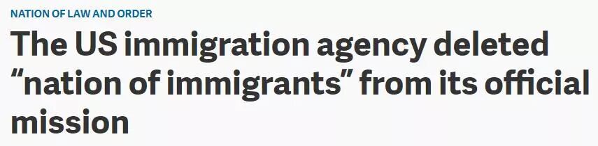 2月22日,联邦公民及移民服务局USCIS突然发表新的《使命宣言 mission statement》,在新的宣言中,USCIS移民局不再提“美国是移民国家”,而是表示要保护美国人和国家的安全,以及尊重美国的价值观。并且不再用“客户”来定位申请者,取消“客户”的表述方式,服务态度转变。