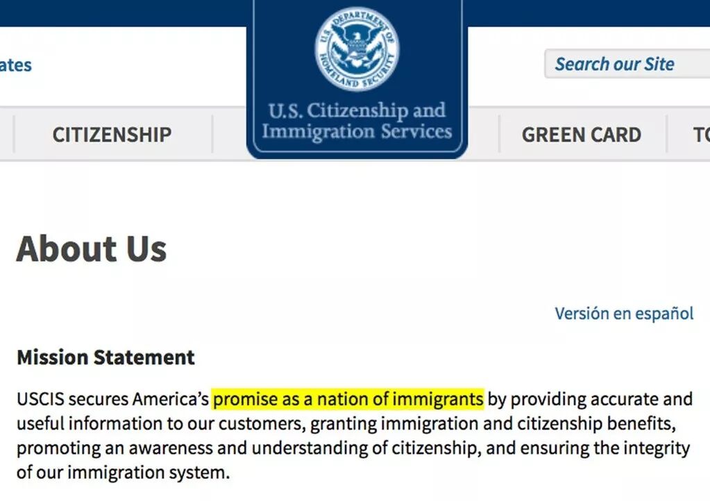 USICS之前的声明截图,新版删除“美国是移民国家的承诺”。