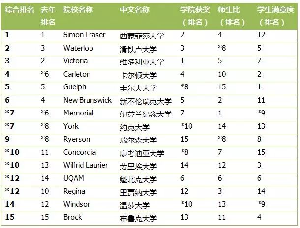 综合类方面,排首位的依然是卑诗省的西蒙弗雷泽大学,而安省的滑铁卢大学今年排名上升1位至第2位。在综合类别中,西蒙弗雷泽大学和维多利亚大学从2007年起就占据第一和第二的位置。西蒙弗雷泽今年保住地位,再度封王。该校在过去25年中有12次位列该类学府榜首。维多利亚大学今年则输给滑铁卢大学,从第二名降至第三名。加拿大15间综合类的大学排名如下: