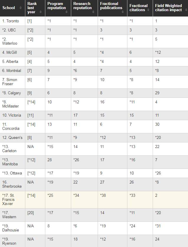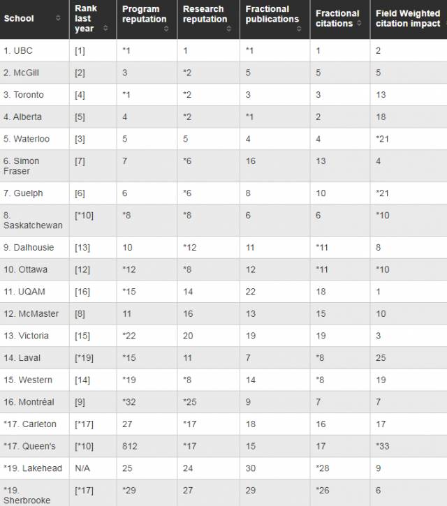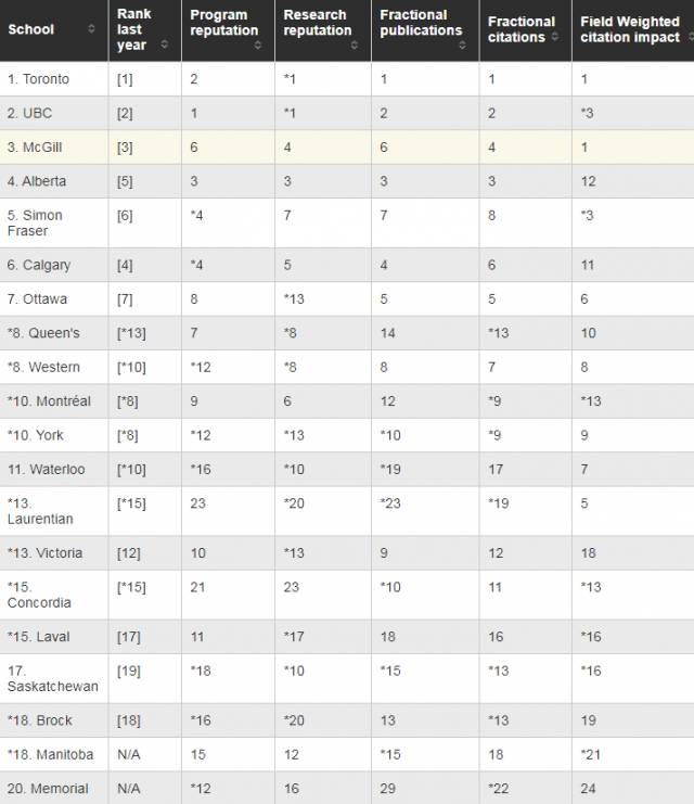 在此次评选的十大专业大学排名中,多伦多大学在七项学科领域的排行榜中均排在首位。它们分别是生物学(与UBC大学并列)、商学(与UBC大学并列)、计算机科学、教育学、工程学(与滑铁卢大学并列)、数学和医学。