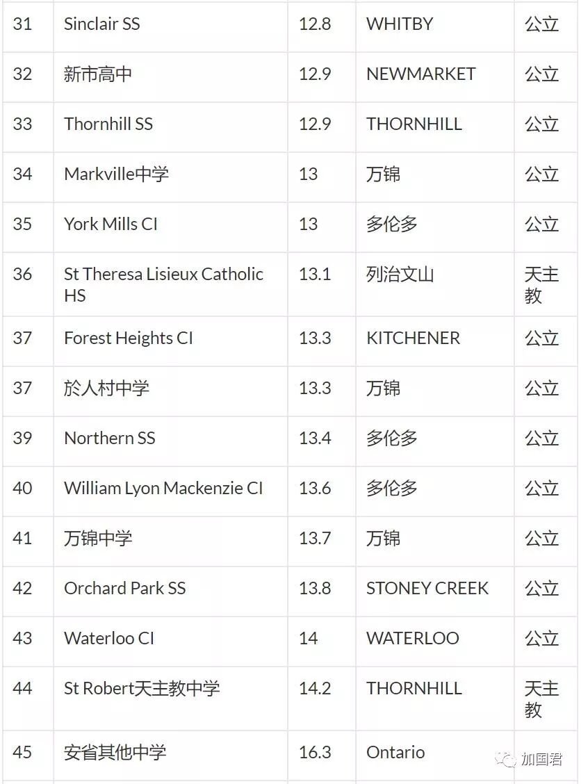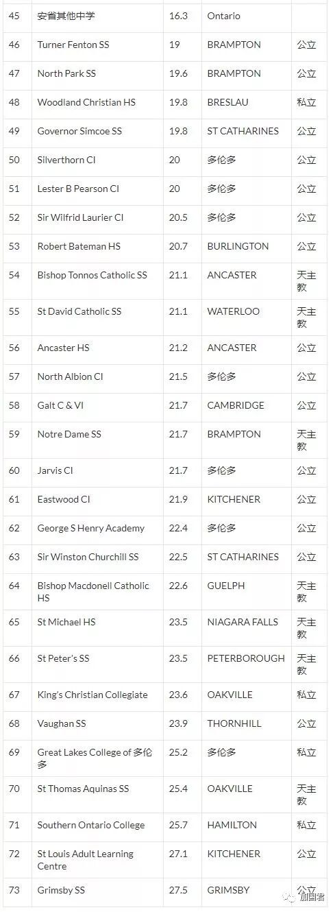 安省其他中学的调整系数为16.3%,排在45名。换言之,在45名之前的学校获得加分,而排名45名之后28间学校则含有水分。